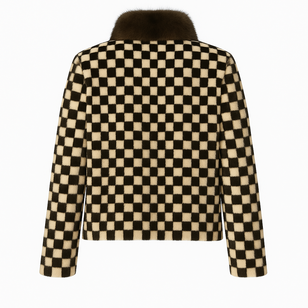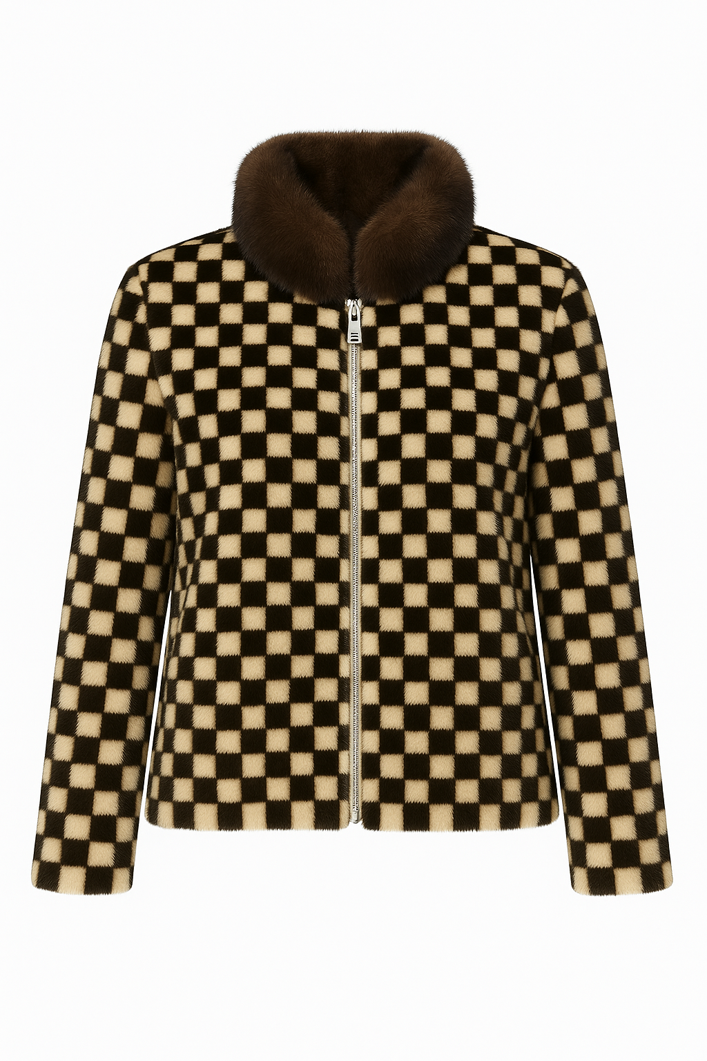 Elevate your cold-weather wardrobe with this striking 25" mink section jacket, crafted in an intricate brown-and-ivory checkerboard pattern. Each mink section is expertly dyed and matched to create a bold geometric texture with exceptional softness and movement. The jacket is finished with a rich, fully dyed sable stand collar—plush, structured, and naturally luminous for a luxurious contrast.