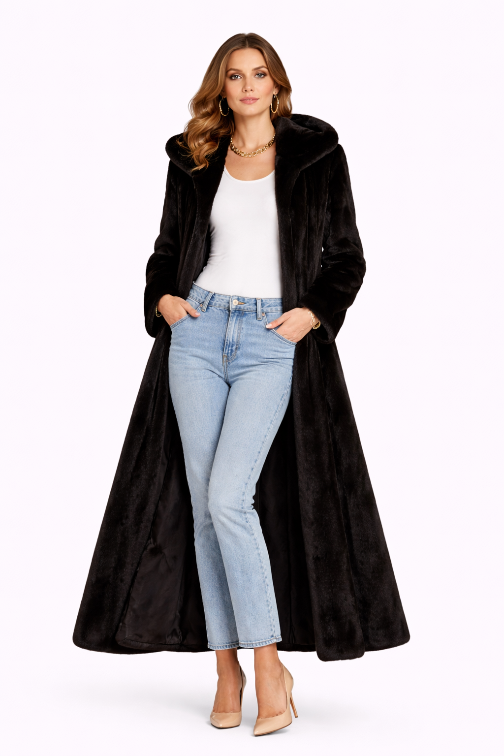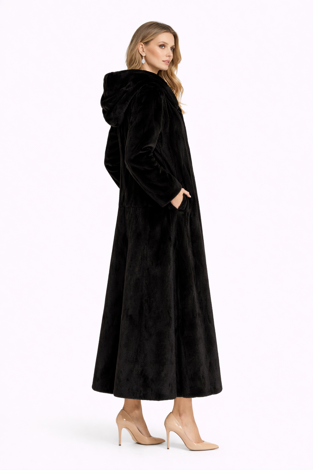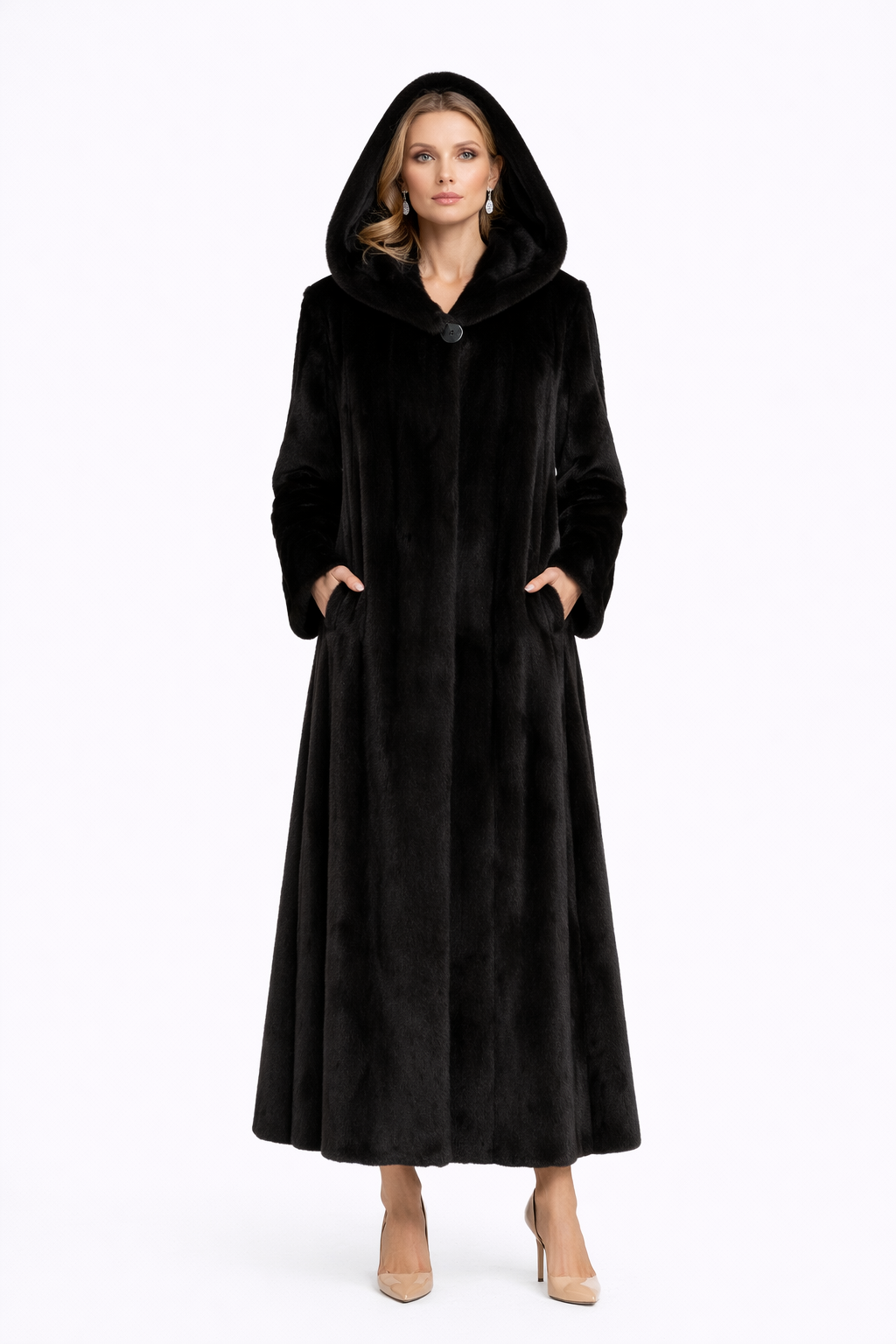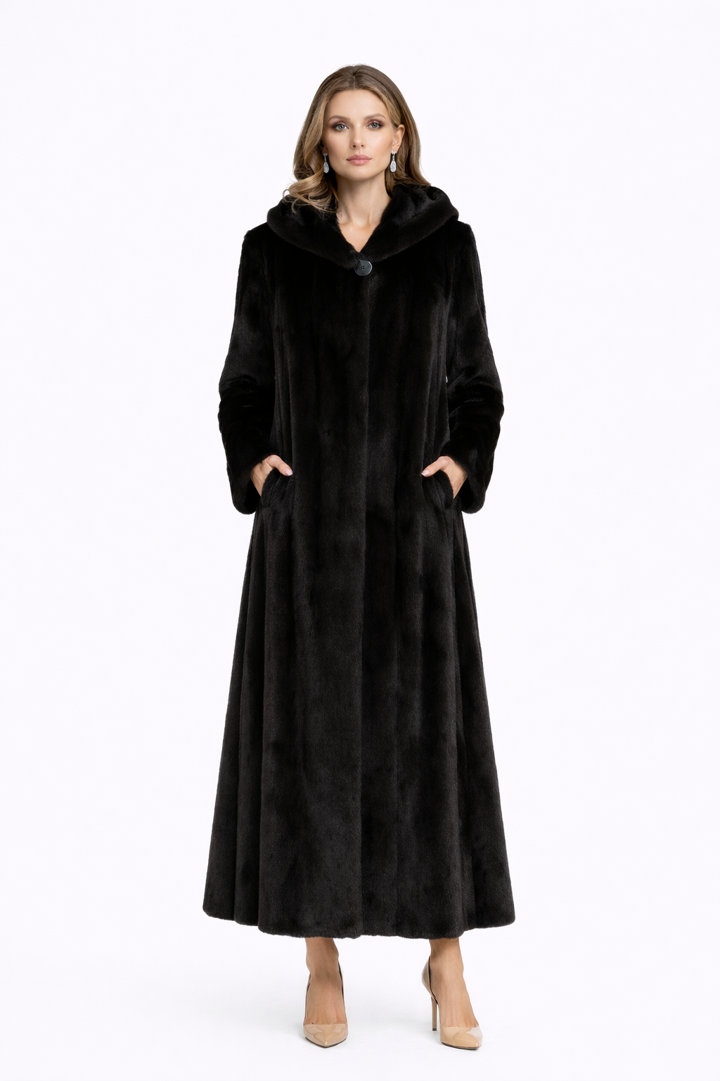 A full-length straight silhouette crafted in luxurious dyed mink, designed with a dramatic hood and refined skin-on-skin construction. The fluid vertical pelting enhances the natural luster of the fur, creating depth, movement, and a beautifully elongated line.