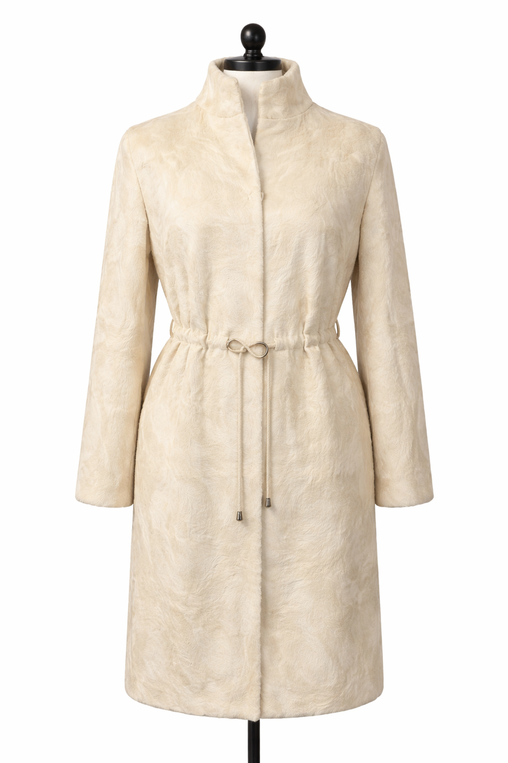 This coat reflects a period when lamb garments were valued for their softness, lightweight warmth, and versatility. The minimalist exterior emphasizes the natural texture of the lamb, while the interior reveals an embroidered taffeta lining, adding a layer of quiet detail intended to be discovered in wear. The adjustable waist drawstring allows flexibility in styling without altering the coat’s original straight proportions. As an archive designer piece, it represents restrained elegance and thoughtful construction.