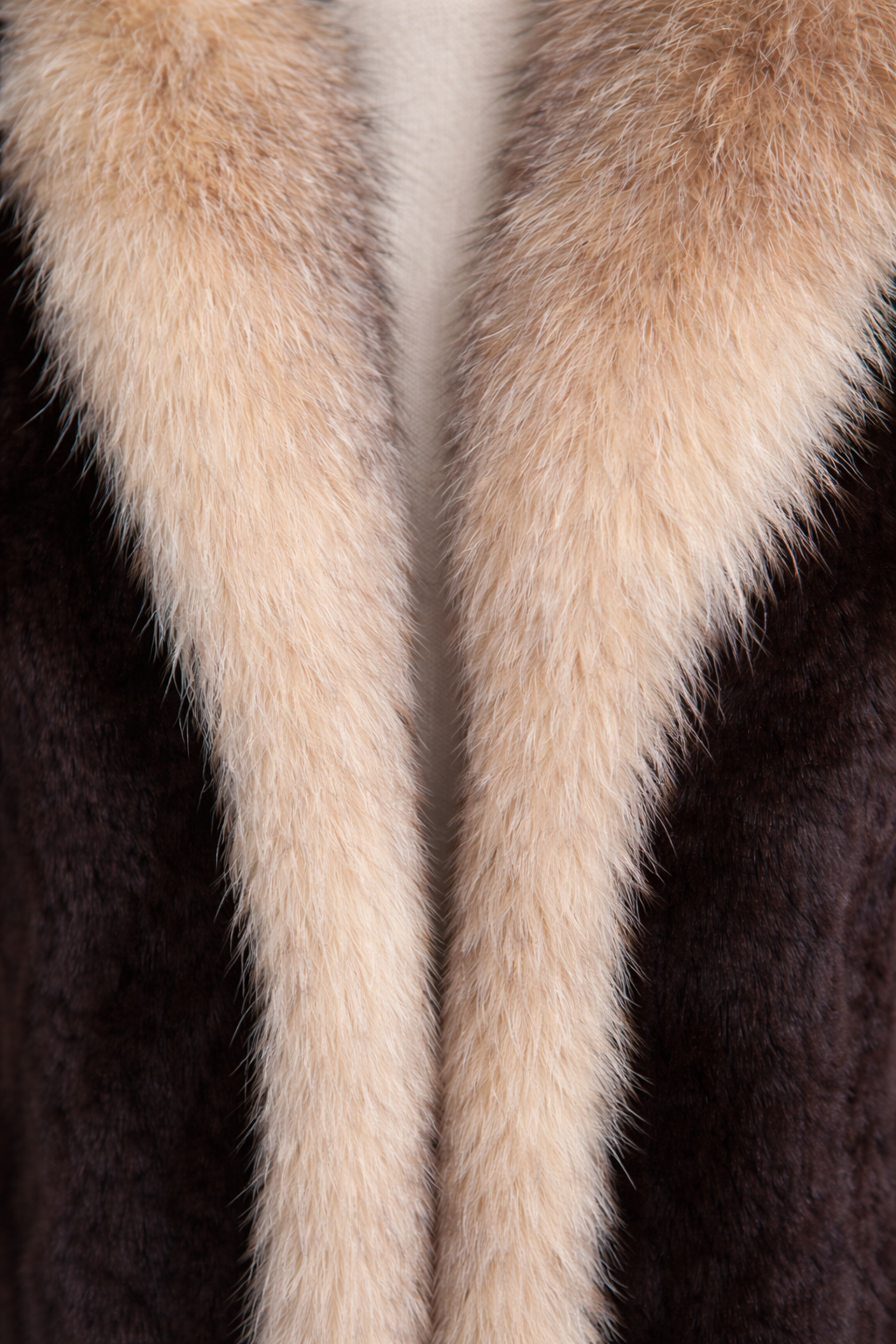 This Archive & Vintage jacket reflects a time when contrast and craftsmanship defined statement outerwear. Cut from dark brown mink, the silhouette is elevated by a crystal-dyed fox tuxedo front, creating a striking interplay of texture, tone, and depth. The fox trim frames the jacket with natural luminosity, while the mink body maintains a rich, polished finish. Designed in a balanced, wearable proportion, this piece embodies classic glamour with archival character. Preserved in good condition, it remains a distinctive example of Maximilian’s heritage design language.