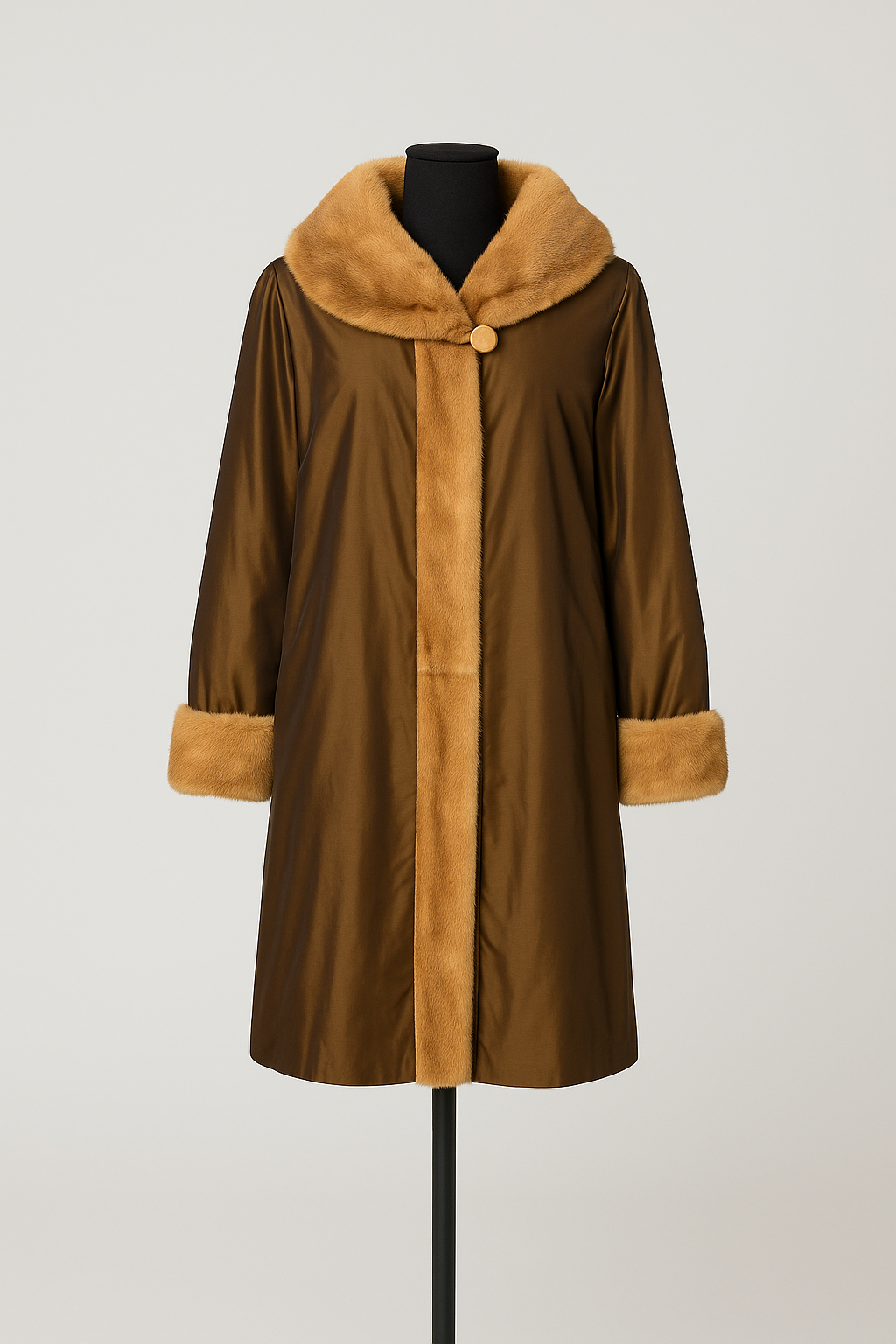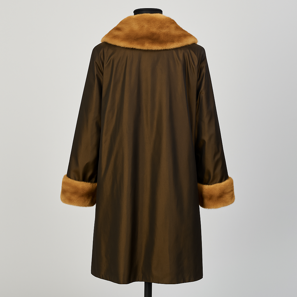 Designed as a reversible garment, the coat offers two distinct expressions: one side in sheared mink for understated elegance, and the reverse in lightweight taffeta for a more streamlined, refined look. A generous collar and fur-trimmed cuffs complete the design, adding balance and comfort on both sides.
