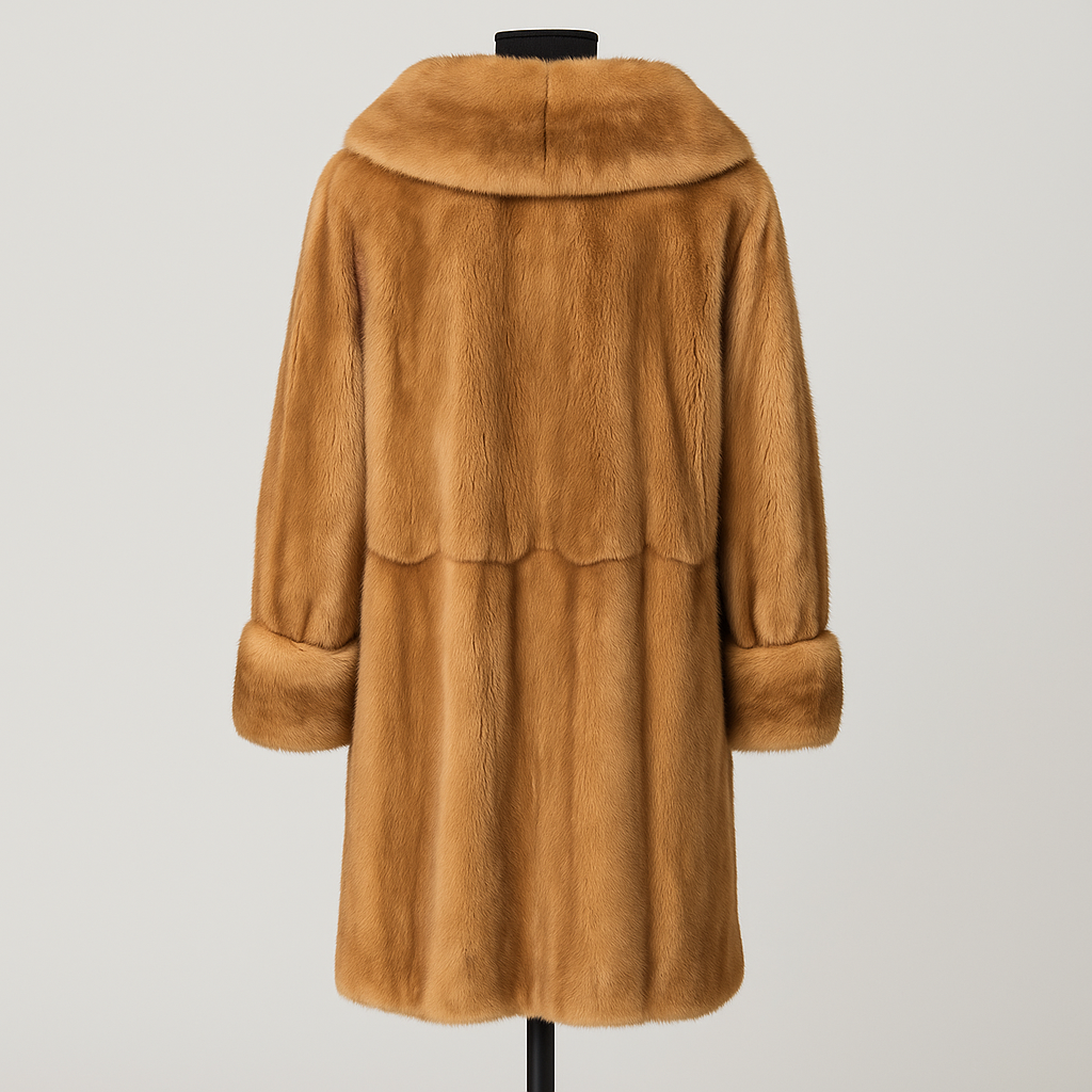 Constructed using skin-on-skin sheared mink, the coat features a smooth, continuous surface with a velvety finish and natural flow. This method of construction reflects a higher level of craftsmanship, allowing the mink to drape fluidly while maintaining warmth and structure. The warm whiskey tone adds depth and richness without overpowering the natural character of the fur.