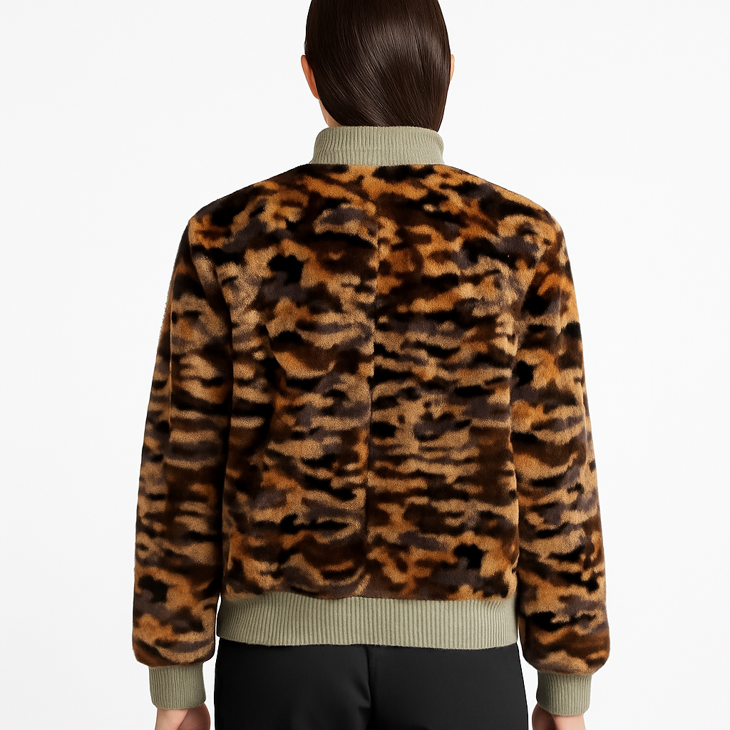 Wear it fur-side out for a rich, eye-catching camouflage pattern with plush mink texture. Flip it to the smooth fabric side for a modern, sporty streetwear look. Finished with sage-green ribbed knit cuffs, hem, and collar, this jacket is effortlessly chic on both sides.