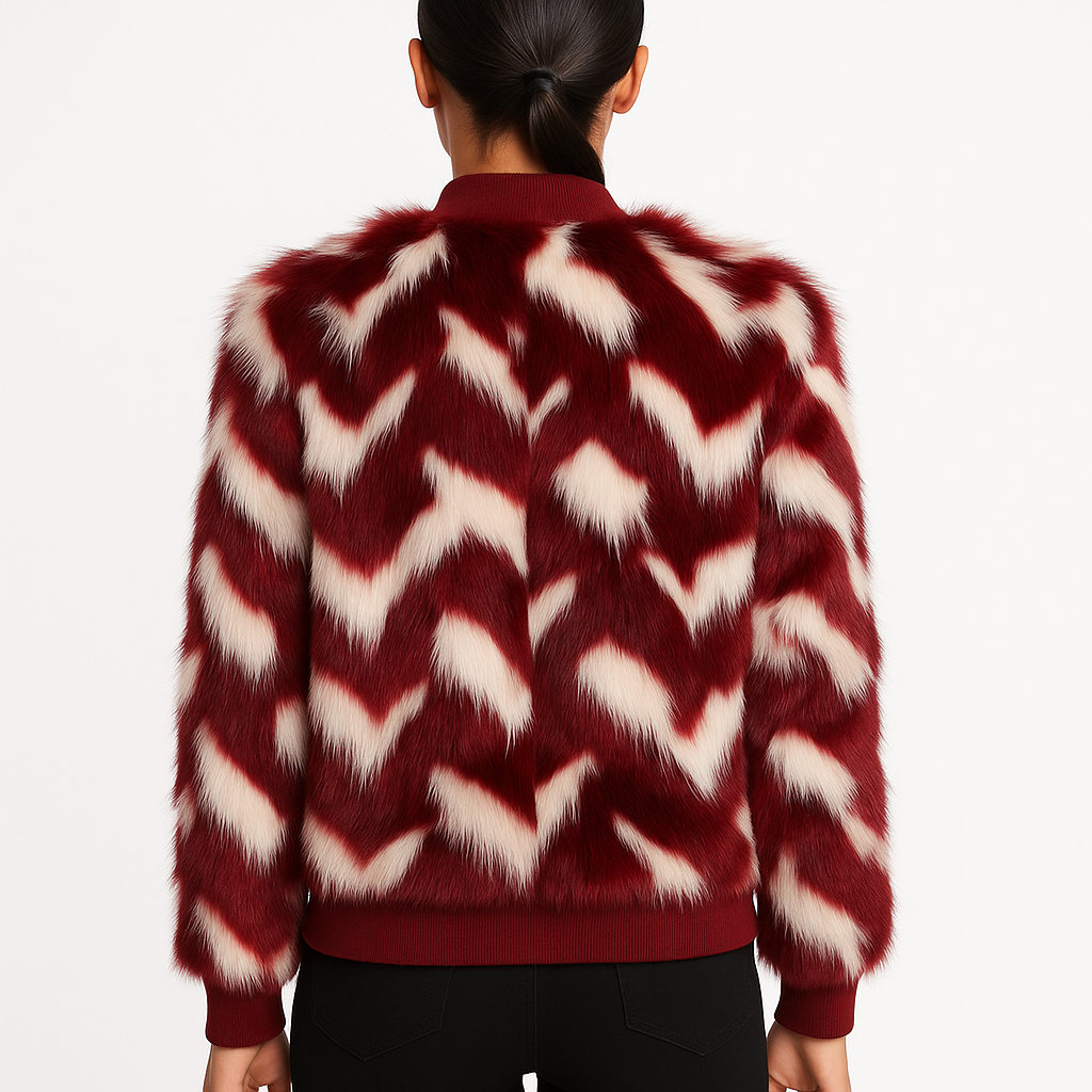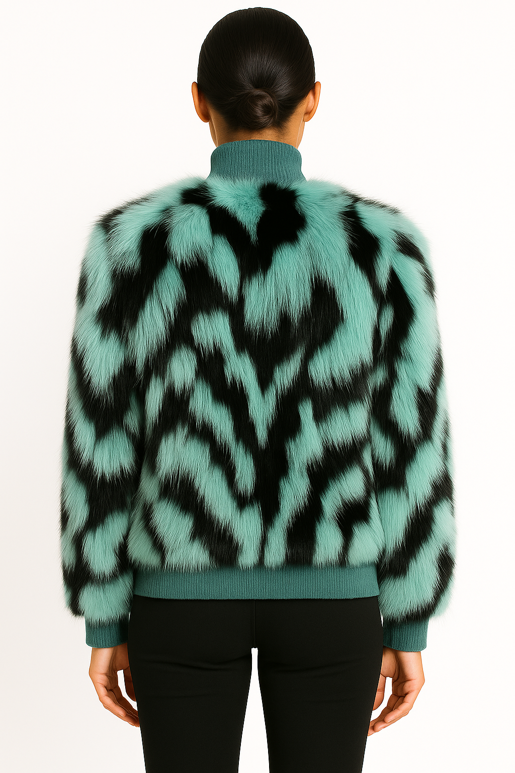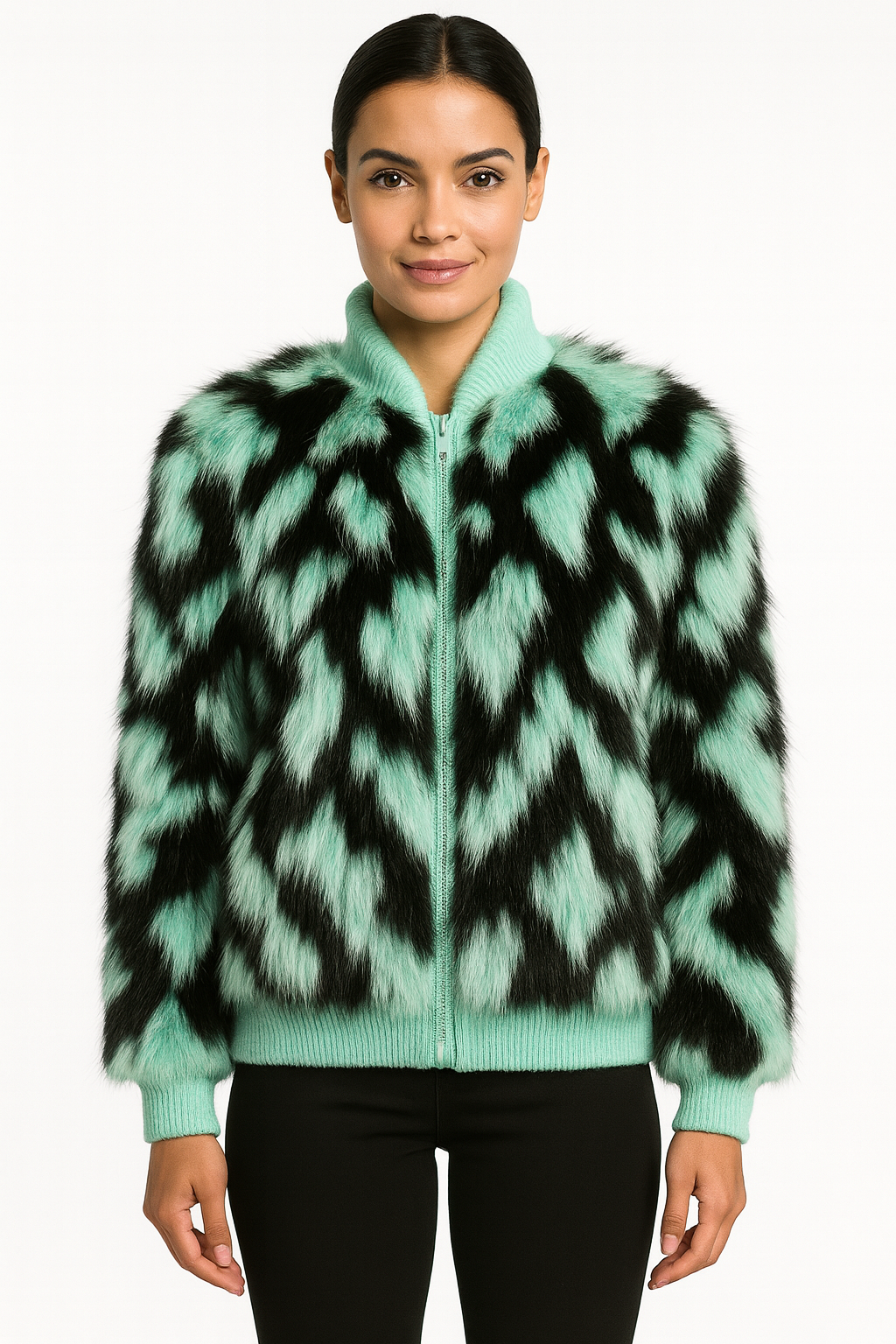 This luxurious 23-inch reversible baseball jacket combines premium Finnish fox fur with sporty modern styling. The fur side features dyed fox sections arranged in a rich, dynamic pattern for a bold, eye-catching look with exceptional softness. Flip the jacket to reveal a sleek polyester fabric side, giving you a lightweight, everyday-wear option while maintaining the same stylish silhouette.