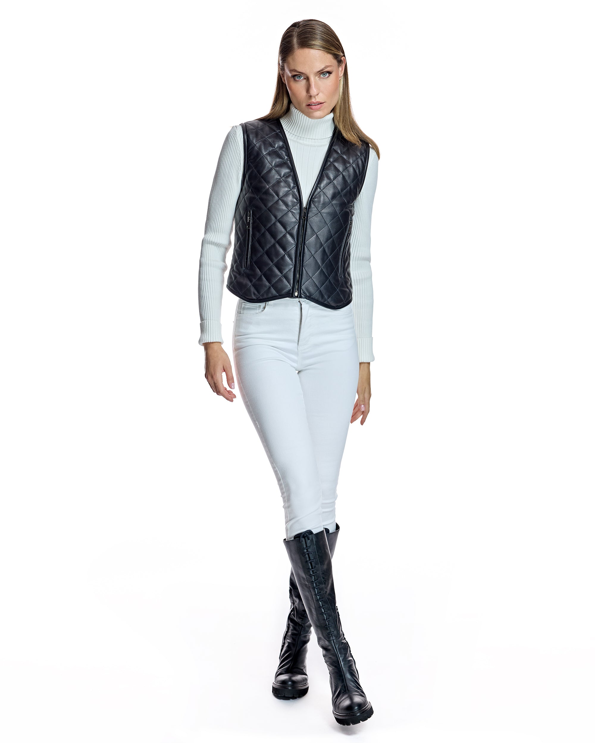 19" LEATHER VEST, STRAIGHT SLEEVE, QUILTED WITH SLIT ZIPPER POCKETS, ZIPPER
