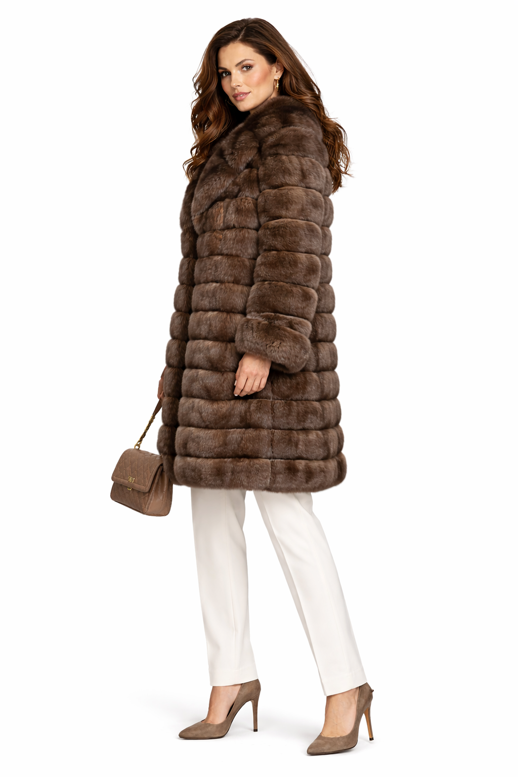 Crafted from the finest Barguzin Russian sable, this 39-inch coat showcases exceptional natural luster and depth, elevated by refined tip-dye artistry that enhances dimension and movement. The horizontal body construction creates a modern, sculpted silhouette while preserving the fluid softness that defines true luxury sable.