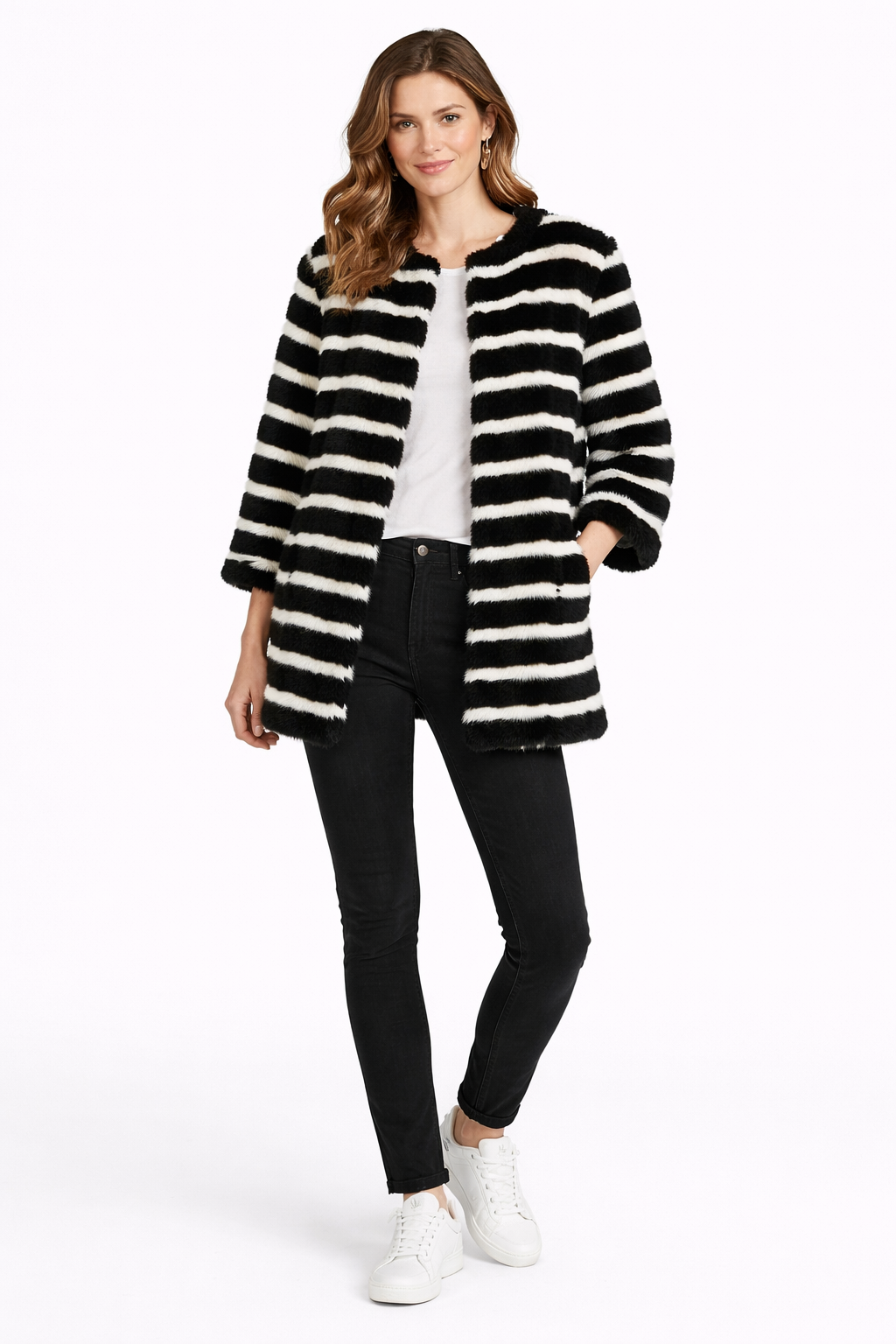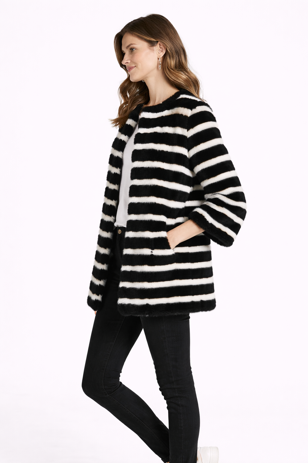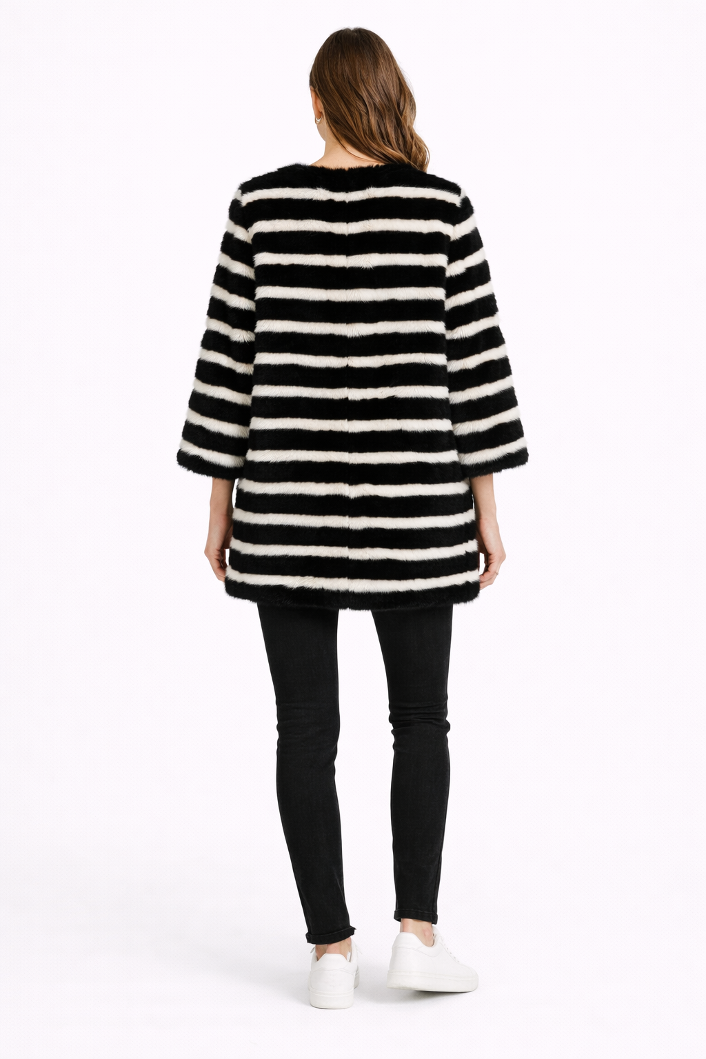 A modern statement silhouette crafted from luxurious knitted mink sections, this 30" jacket blends graphic black and white striping with soft texture and fluid movement. Lightweight yet warm, the knitted construction offers flexibility and effortless layering.