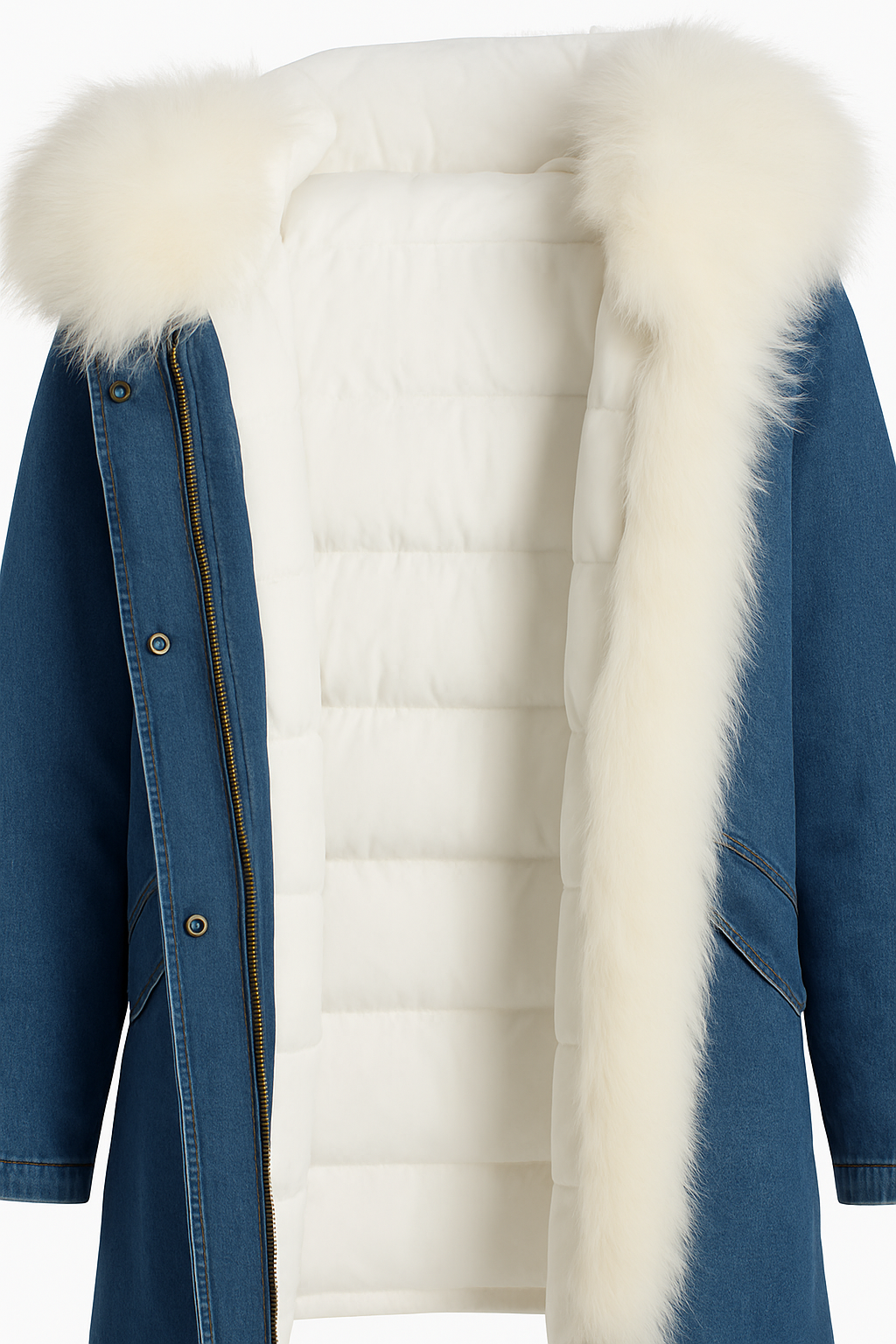 Upgrade your cold-weather wardrobe with this statement-making 36" denim parka, designed with a modern sporty edge and luxurious details. A plush bleached lamb fur hood and tuxedo trim frame the silhouette, adding softness and elevated texture. The interior features a fully detachable white down liner made from 100% cotton, offering breathable comfort and adjustable warmth for changing seasons.