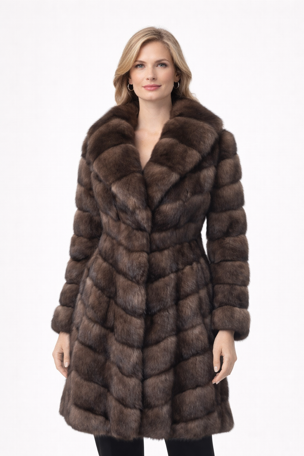 An exceptional expression of refined luxury, this 39" tip-dyed sable coat is masterfully crafted from premium Russian sable fur, prized for its unparalleled softness, depth, and natural sheen. The elegant shawl collar frames the neckline beautifully, while the chevron-patterned body enhances movement and texture.