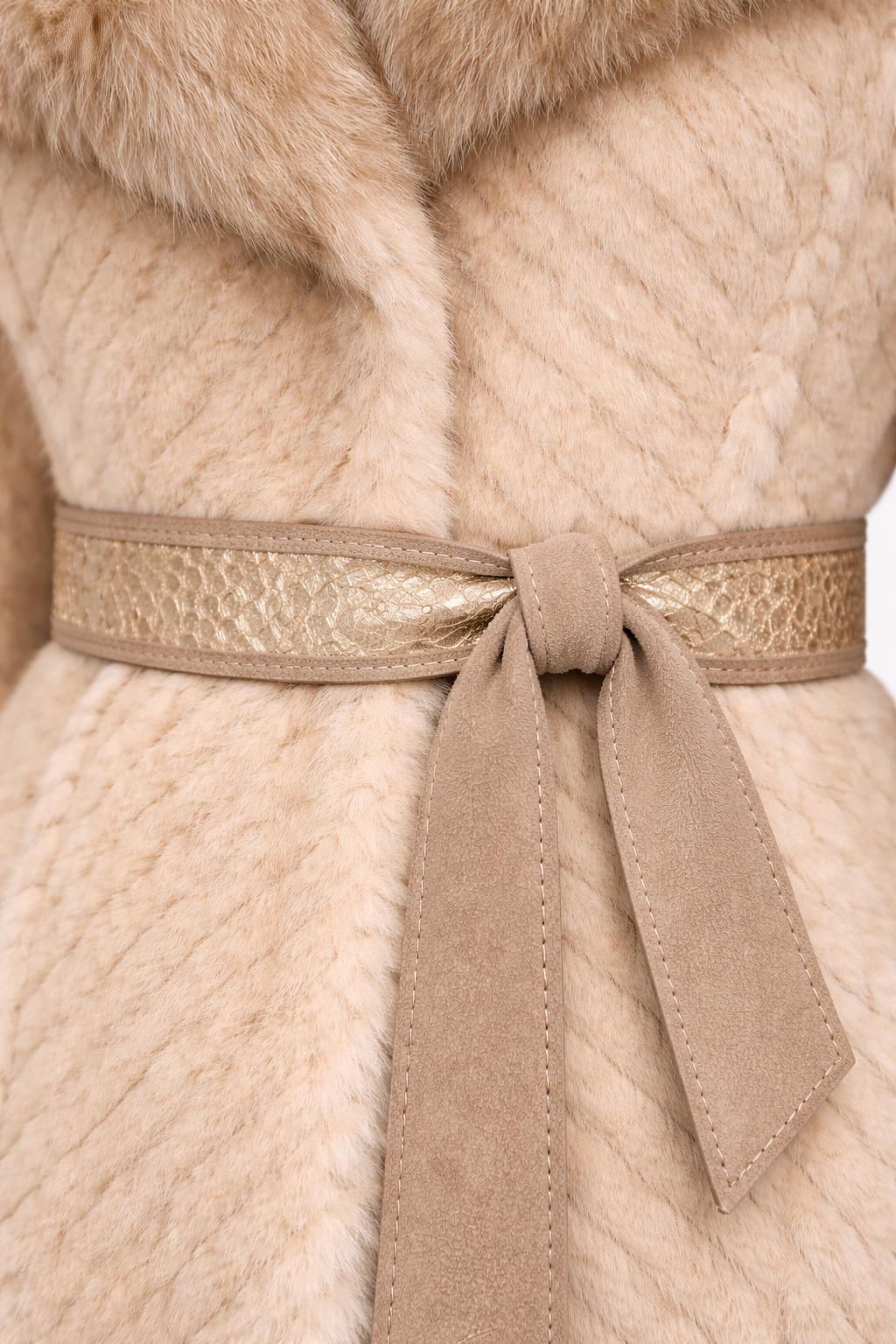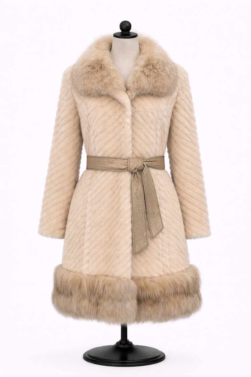 37” Dyed Grooved Mink Coat with Dyed Fox Wing Collar, Fox Hem & Belt