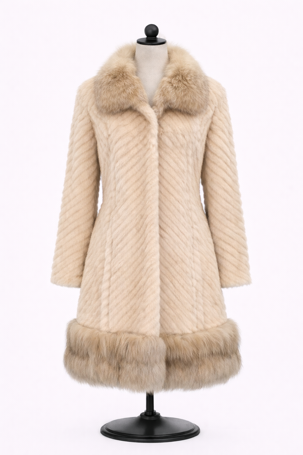 A refined statement from the Maximilian Archive & Vintage Collection, this 37-inch dyed grooved mink coat exemplifies timeless elegance through texture, proportion, and archival craftsmanship. Balanced and sculptural, the design highlights the natural beauty of grooved mink accented by plush fox detailing.