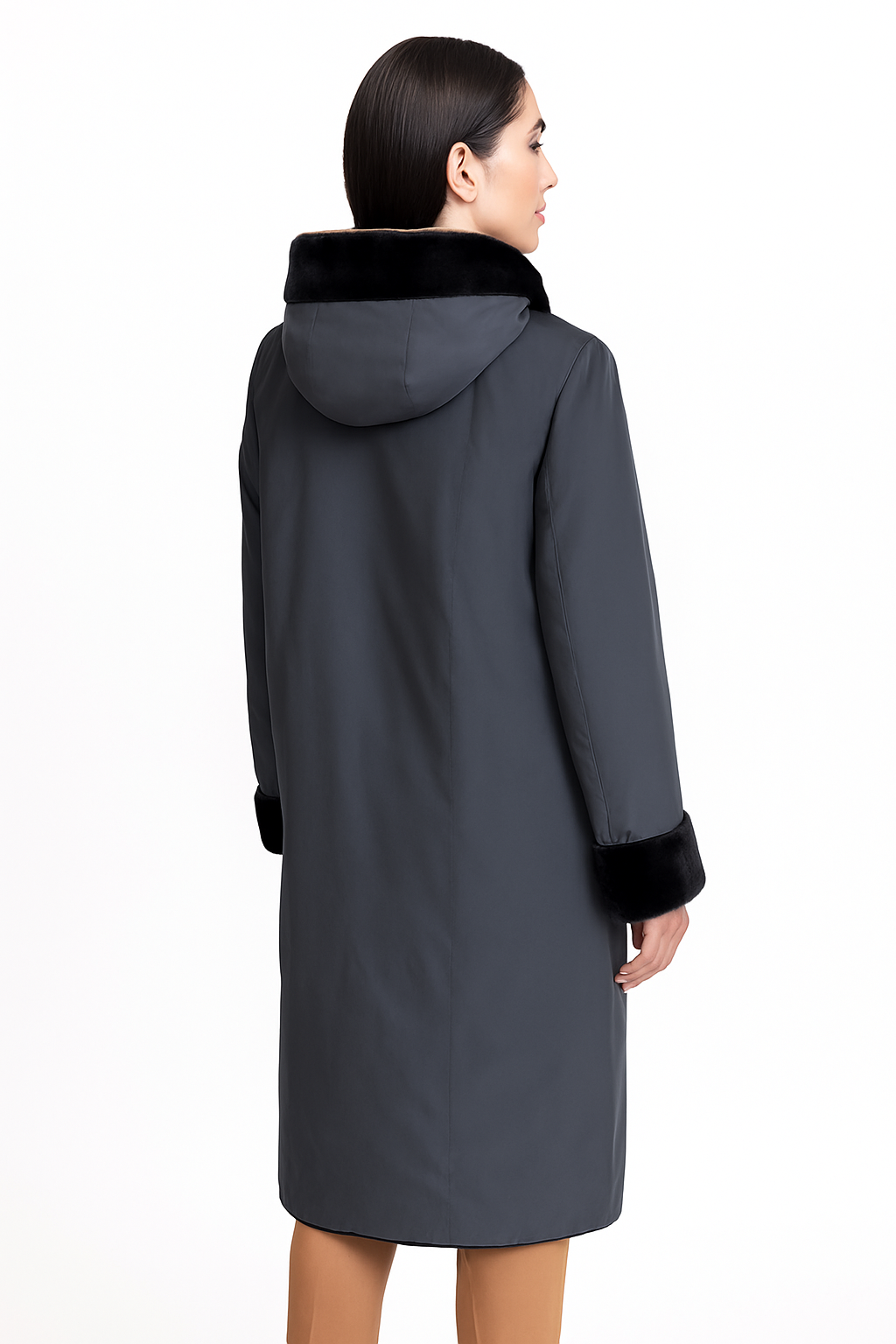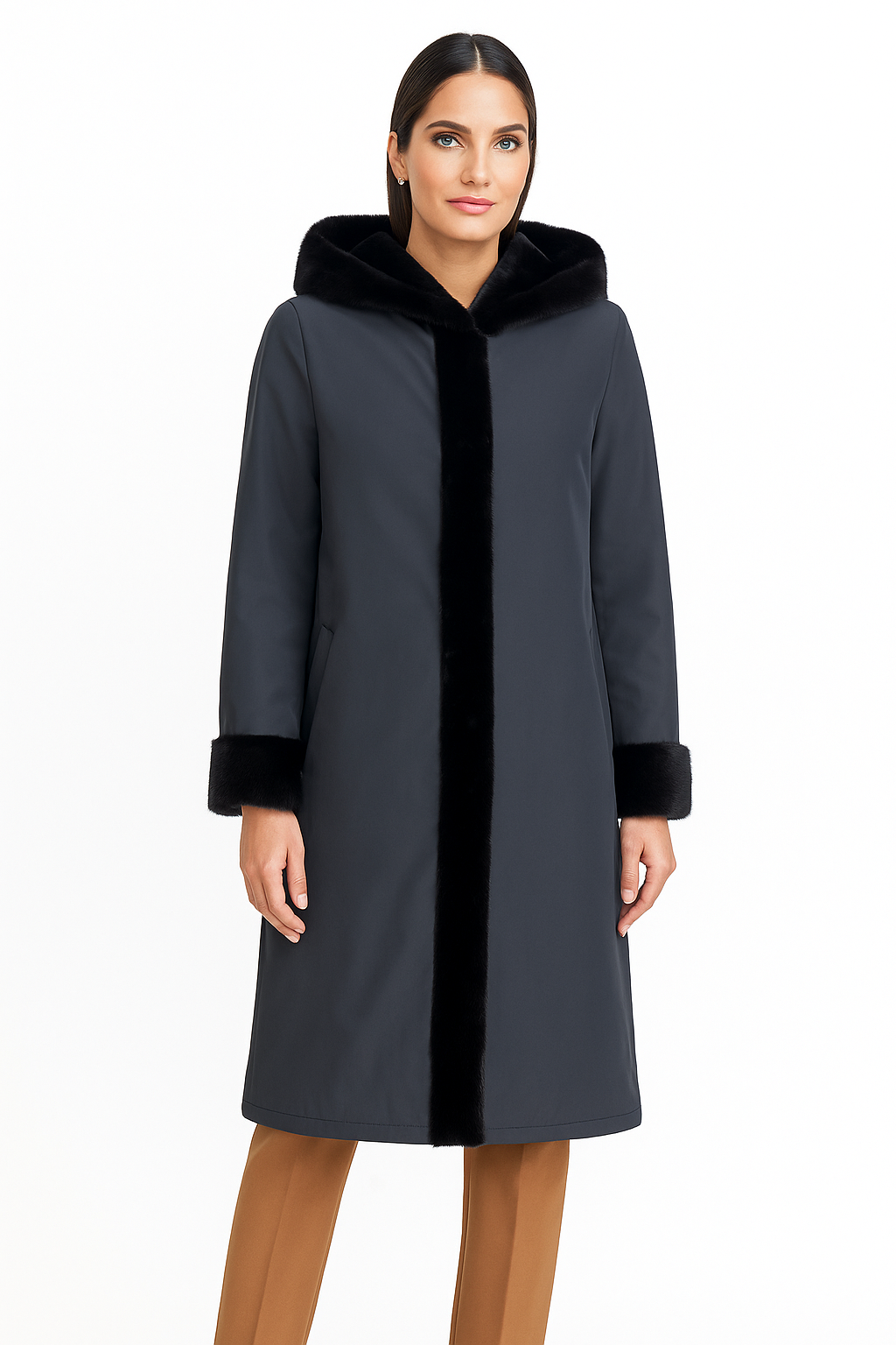 Perfect for travel, city living, and transitional weather, this coat offers two distinct looks in one—effortlessly shifting from plush fur to polished fabric while maintaining a timeless, knee-length profile.
